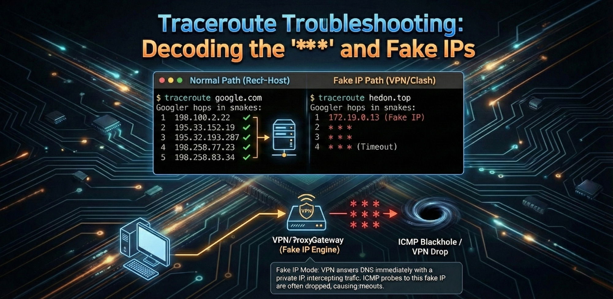 198.18.x.x,但也可以配置成172.x.x.x),然后由代理软件接管流量。又因为大多数 VPN 软件的 Fake IP 逻辑只处理 TCP/UDP 数据流(用来浏览网页),它并不支持通过 Fake IP 来做 ICMP 路由探测。所以就导致了探测包发出去如泥牛入海,VPN 不回信,真实服务器更收不到(因为根本没发给真实 IP),所以看到的全是
