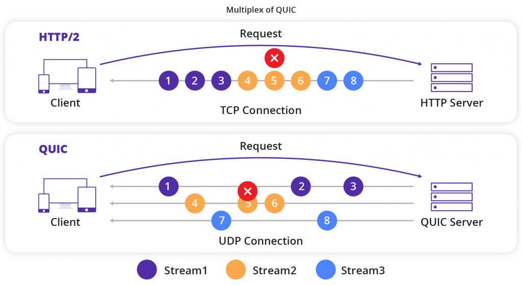 - QUIC: 并不是单纯的一条路,而是并行的多车道(Stream)。图片 A 的包丢了,只影响图片 A,不影响旁边的 CSS 文件和文字加载。这是 QUIC 最核心的优势。