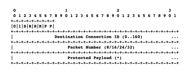 短首部(Short Header):用于连接建立后的数据传输(1-RTT)。第一字节最高位为 0。仅包含 Destination CID(可选)和 Packet Number。这极大地减少了头部开销。