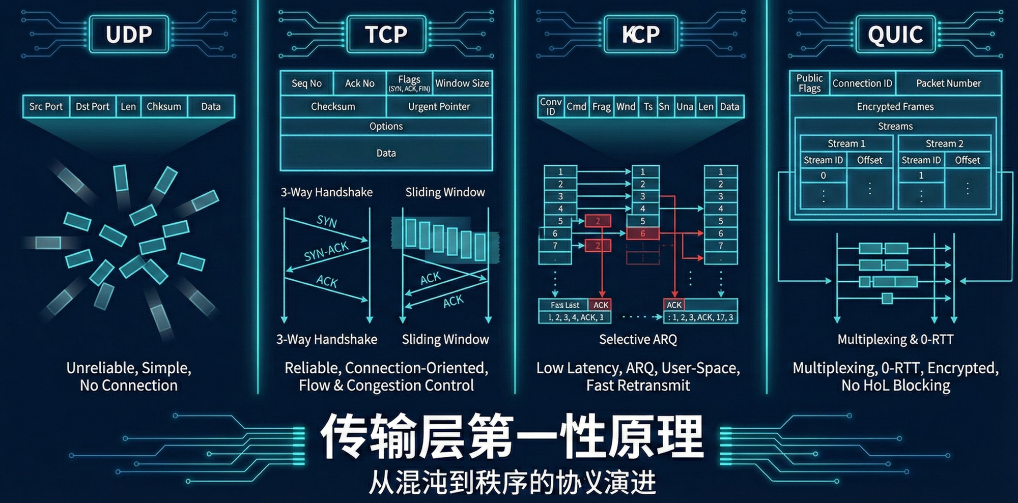 我们将这四个协议分为三个代际来理解:二元对立的世界 (TCP vs UDP)、暴力美学的补丁 (KCP) 和 颠覆架构的革命 (QUIC / HTTP3)。