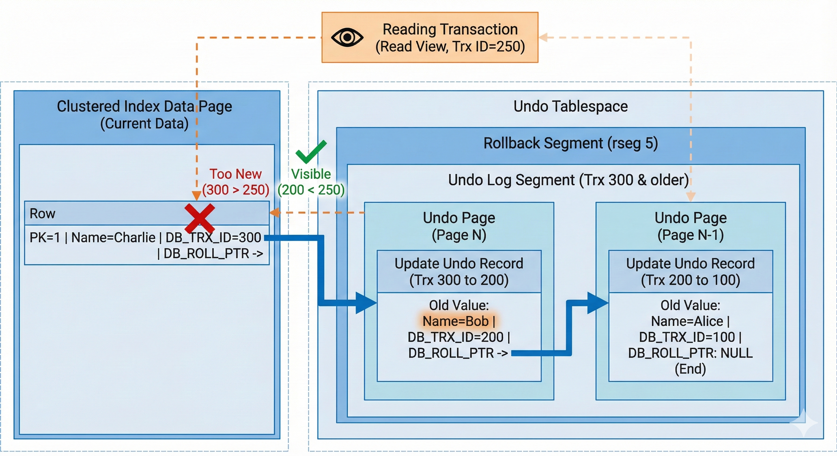 - Page Write: 事务在 Undo Page 中顺序写入 Undo Log Record。若当前页写满,则通过 Segment 申请新页,并更新页头的双向链表指针。