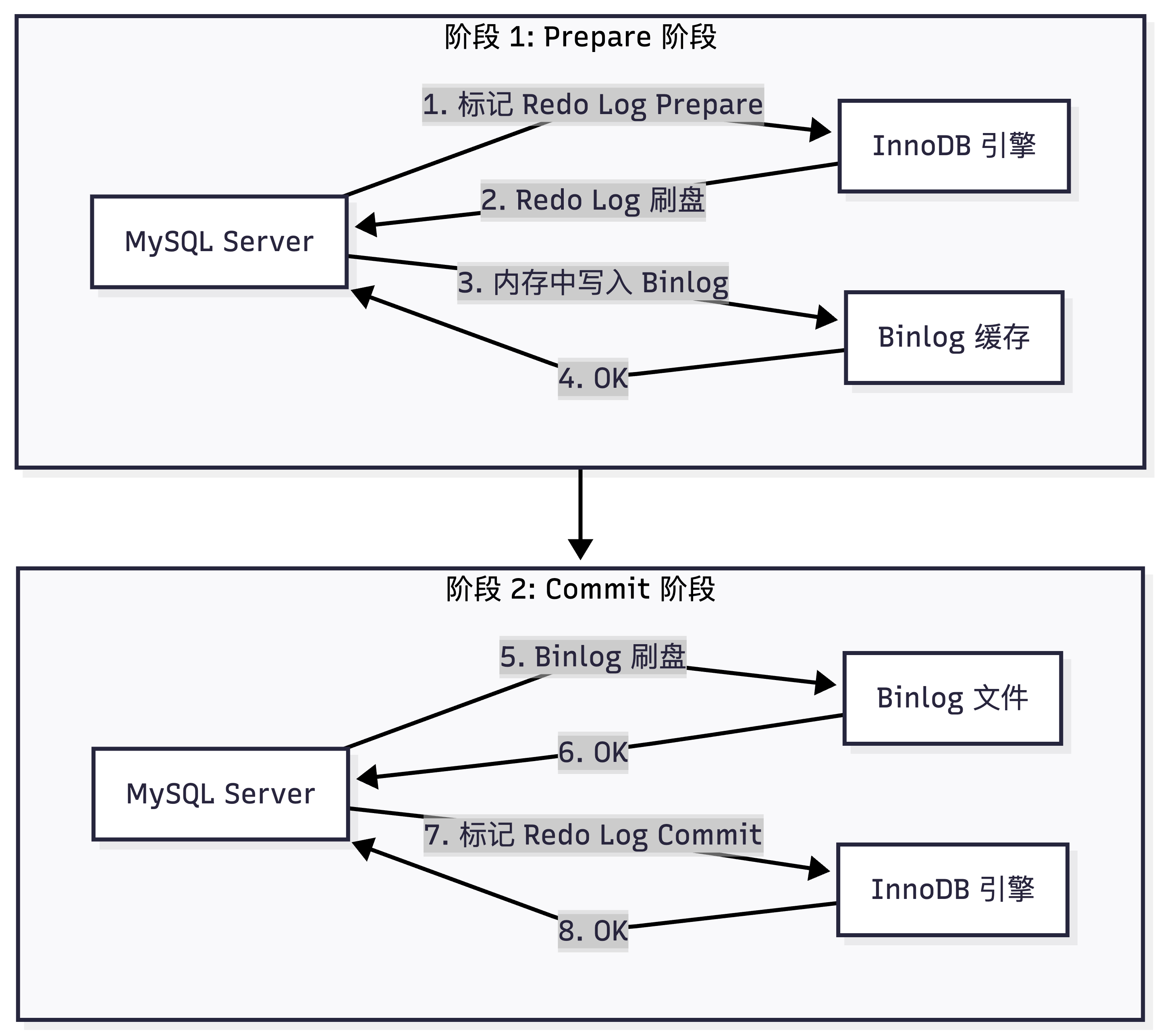 由于 MySQL 是插件式存储引擎架构,Binlog 作为 Server 层的全局日志,必须通过 两阶段提交(2PC) 与存储引擎层的 Redo Log 强绑定,才能在逻辑上构成一个完整的、可恢复的事务。