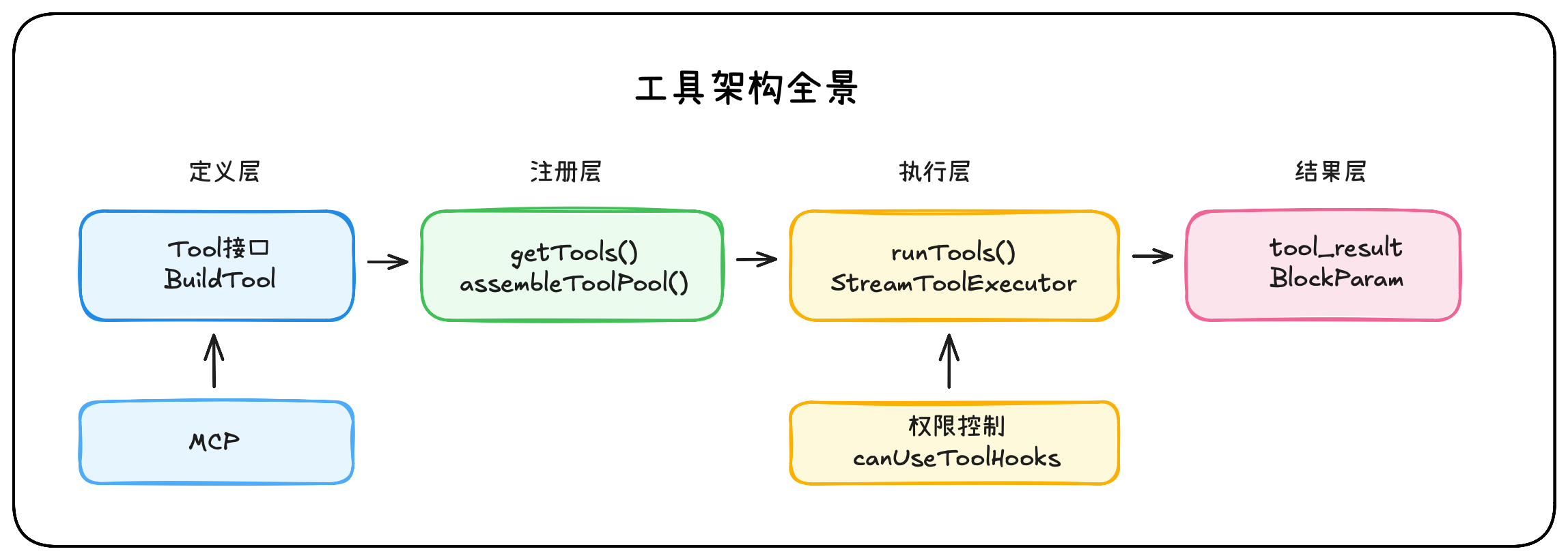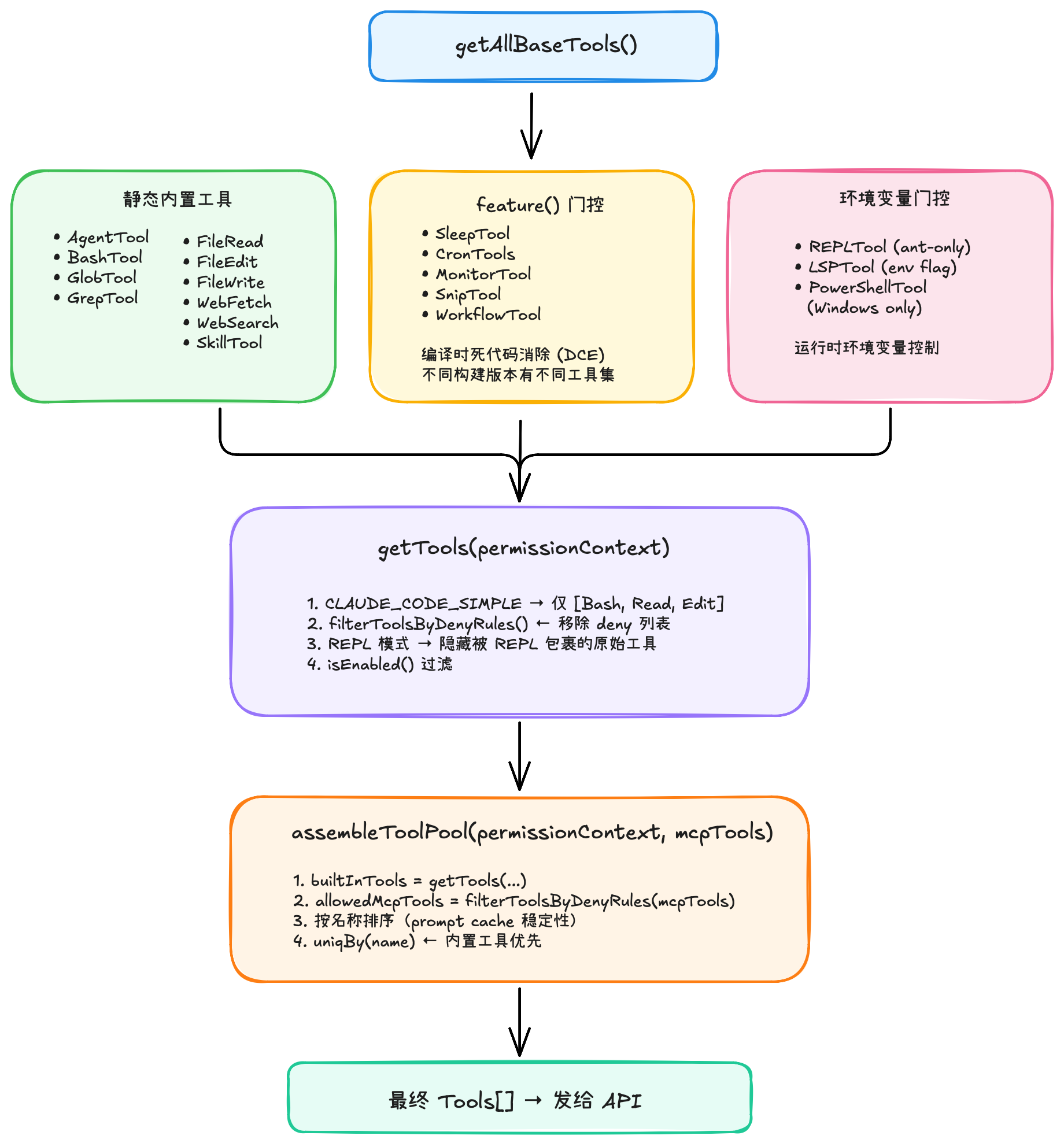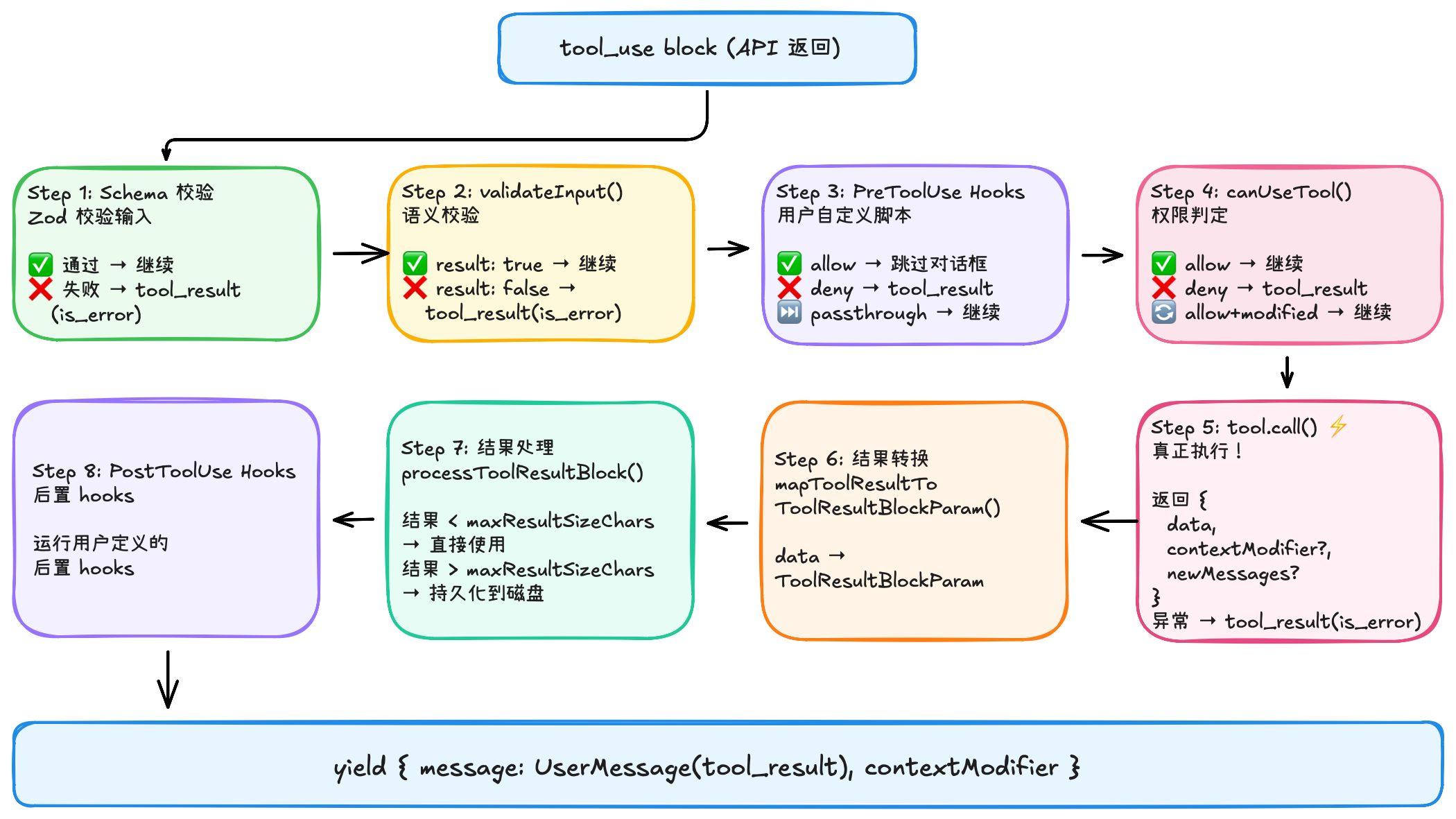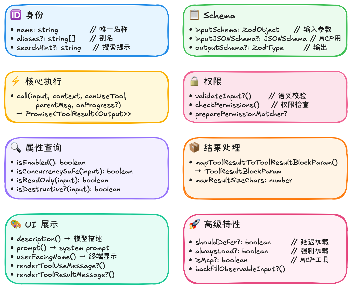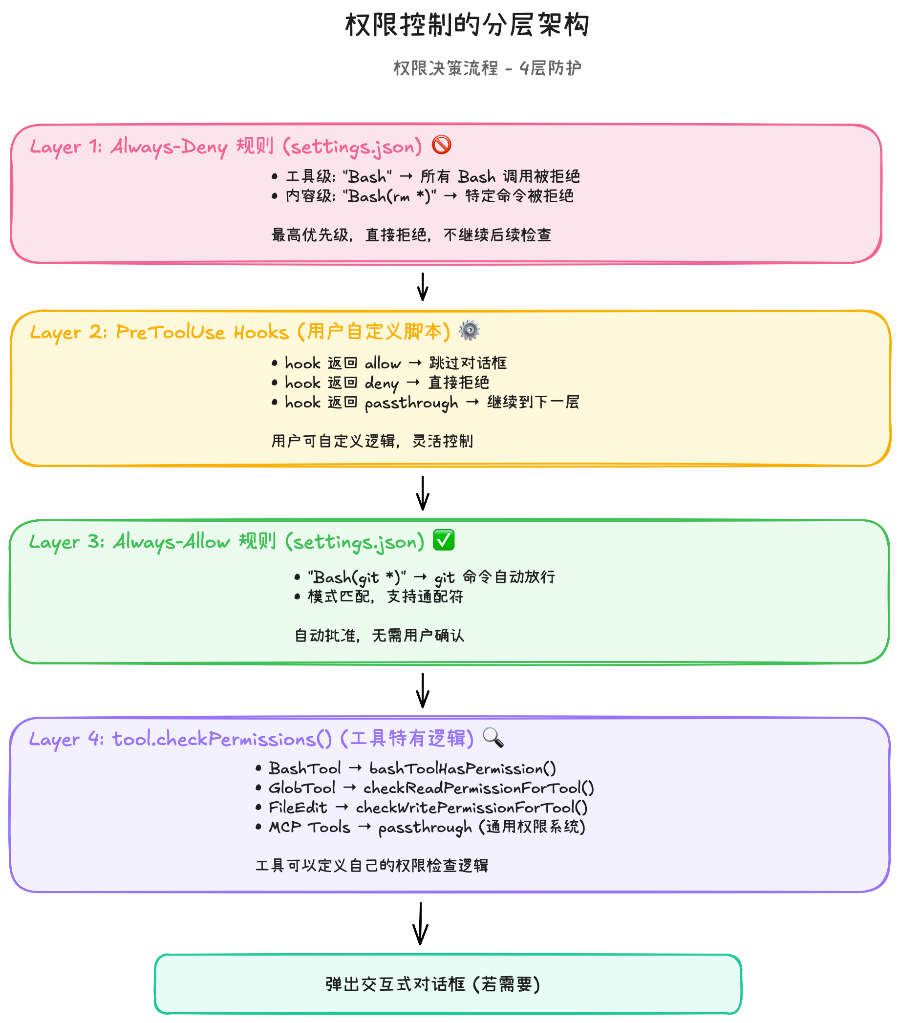 | 权限控制 | deny 规则 → hooks → allow 规则 → 交互确认 | 用户不同意不准改 |