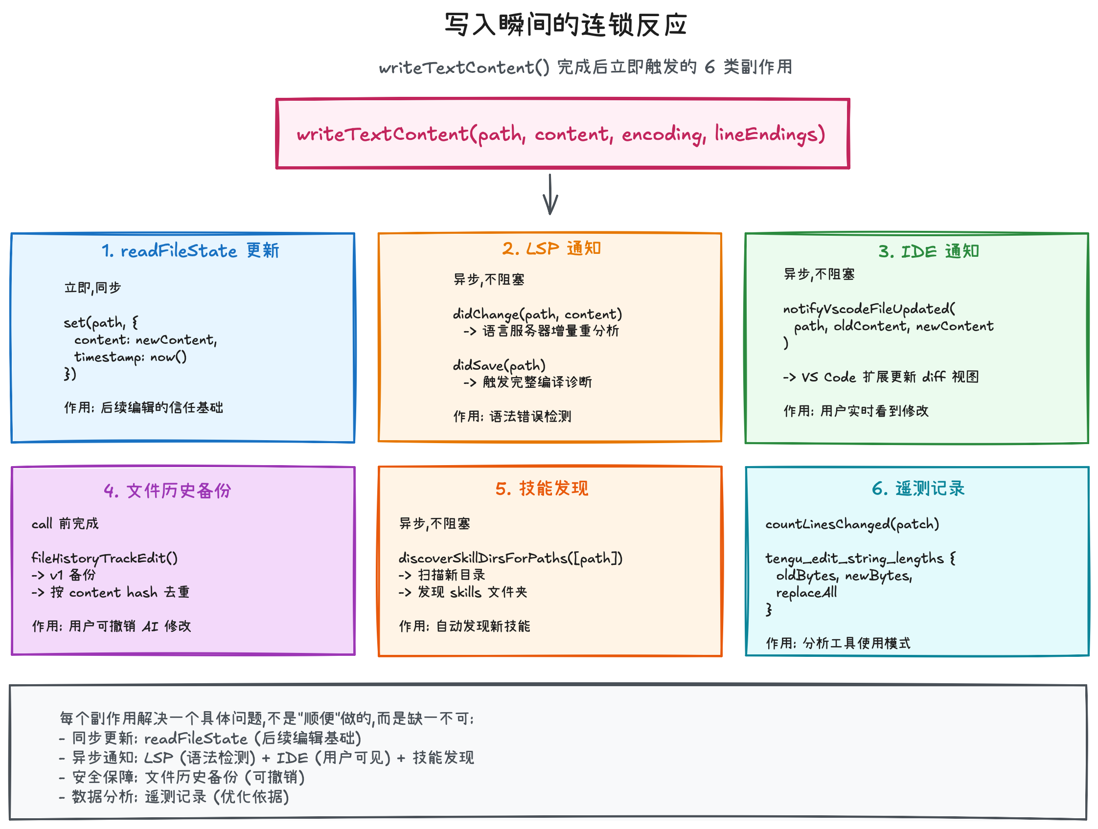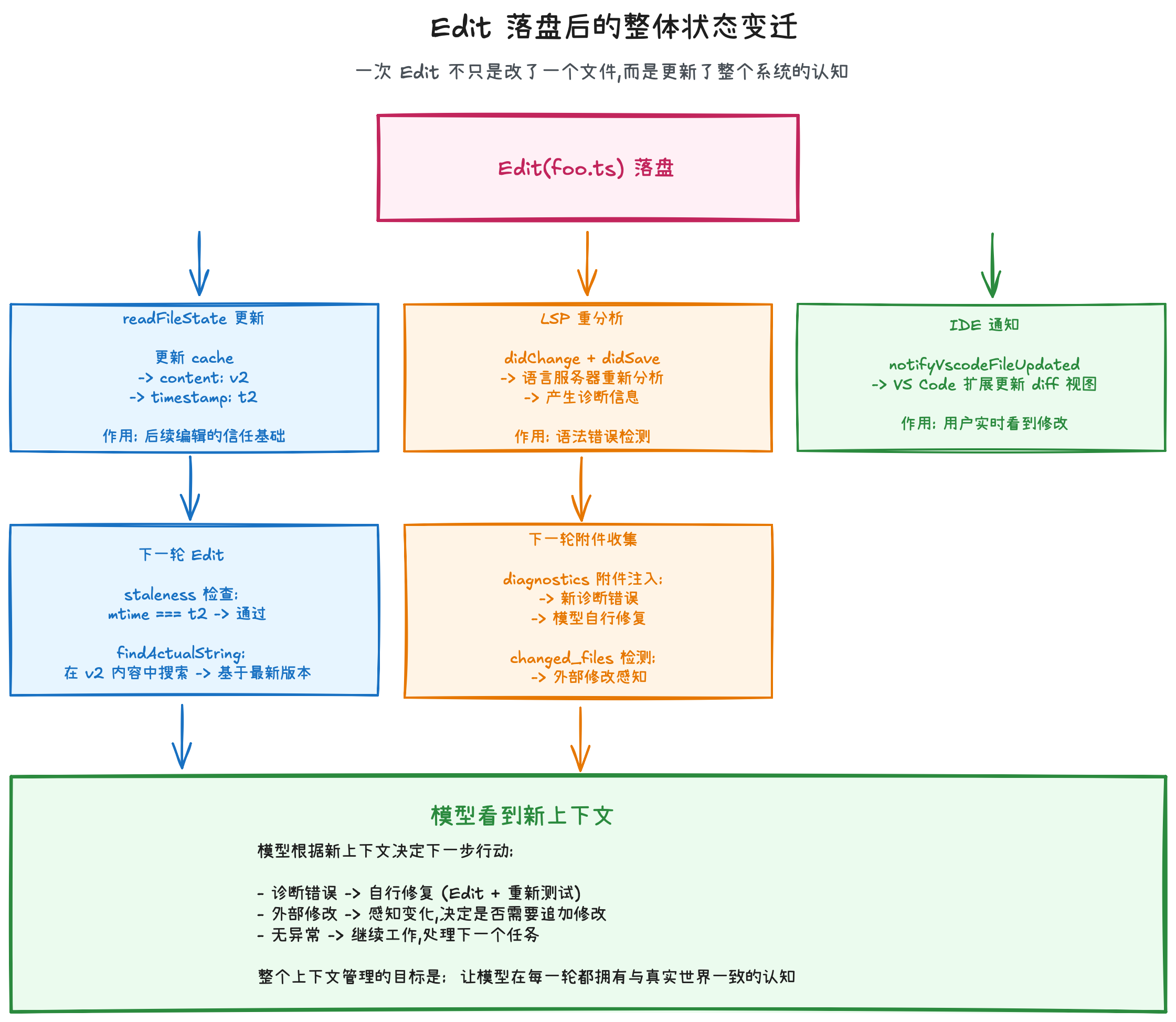 一次 Edit 不只是"改了一个文件"——它更新了系统的文件认知(readFileState)、触发了语言服务器重分析(LSP)、通知了用户的 IDE(VSCode)、创建了可撤销的备份(fileHistory),并在下一轮对话中通过附件系统将所有变化反馈给模型。整个上下文管理的目标是:让模型在每一轮都拥有与真实世界一致的认知。