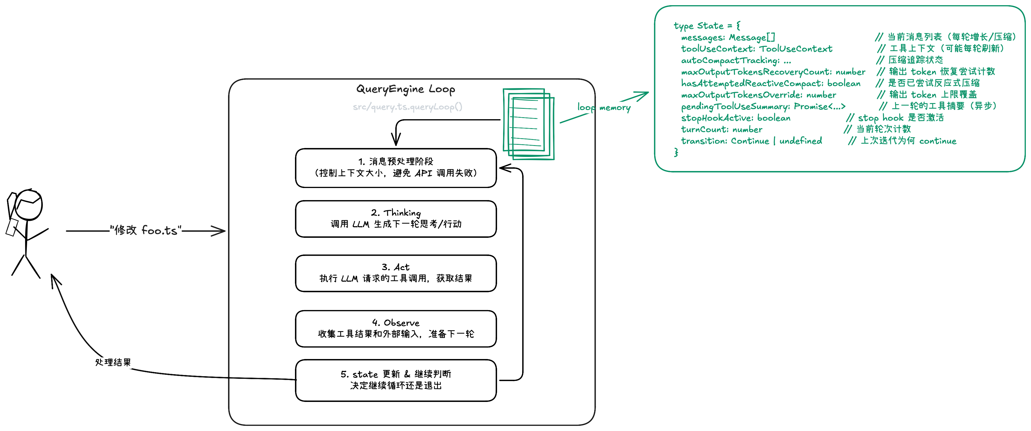 Claude Code 的修改不是一次性的,而是对话循环驱动的多轮工具调用: