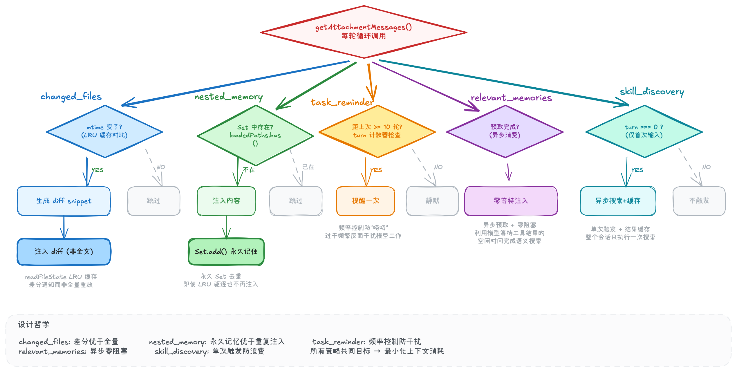 核心原则:模型的世界模型必须与真实状态保持同步。 每当外部状态变化,附件系统负责"通知"模型。注意这里的关键词是"delta"——很多附件名字里就带着"变化"的含义,因为它们只在状态改变时才注入。